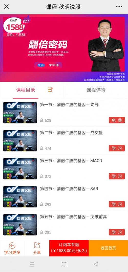 宋华涛老师主讲的翻倍密码,本课程主要讲述翻倍牛股的十一大基因,共9节课,解密让利润最大化的独门交易策略。