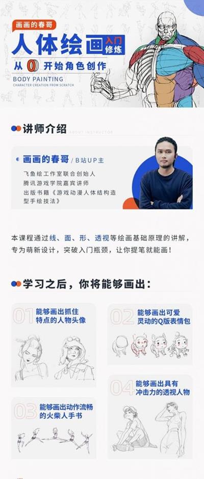 《人体绘画:从0开始角色创作》本课程通过线、面、形、透视等绘画基础原理的讲解,专为萌新设计,突破人体绘画入门瓶颈,让你提笔就能画!