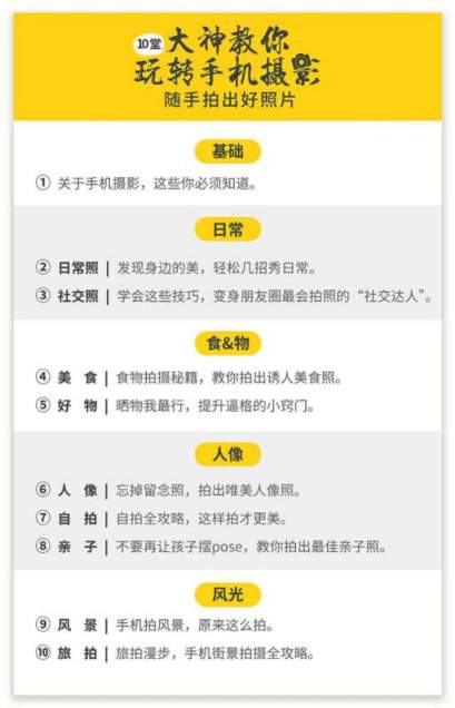 10堂视频课+大咖直播互动:左手和千里导师讲成为你的手机摄影教练,从小白到大神,轻松拍出惊艳朋友圈的美照。