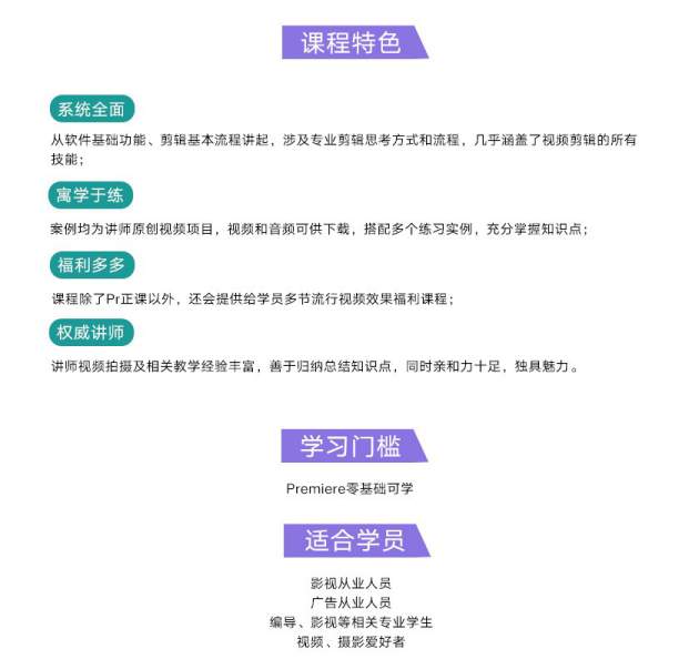1.系统全面。本课程从软件的基本功能和剪辑的基本流程开始讲起,几乎涵盖了视频剪辑的所有技能,更教会学员作为一个专业视频剪辑师的正确思考方式和工作流程。