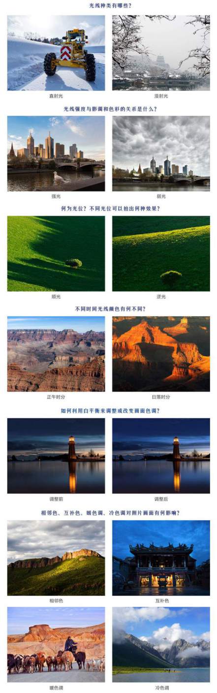 老师将从“认识光线”、“光的强度”、“光线的角度”、“光线的颜色”、“改变自然界的色彩”、“色彩组合”6个知识点入手,由浅入深、循序渐进的用大量的作品实例来解答如下问题: