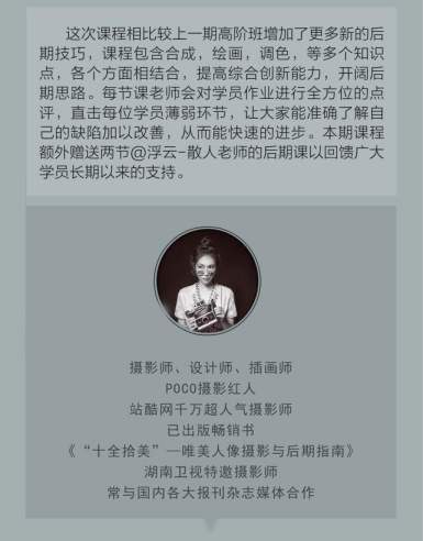 这次课程相比较上一期高阶班增加了更多新的后期技巧,课程包含合成,绘画,调色,等多个知识点,各个方面相结合,提高综合创新能力,开阔后期思路。每节课老师会对学员作业进行全方位的点评,直击每位学员薄弱环节,让大家能准确了解自己的缺陷加以改善,从而能快速的进步。