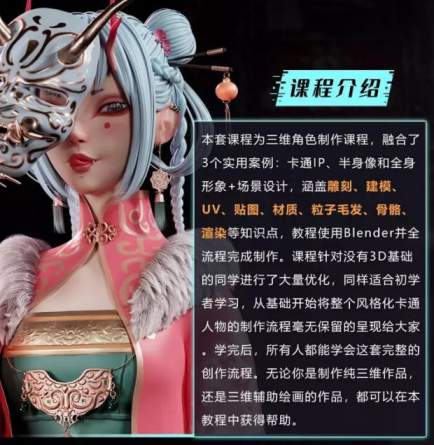 本套课程为三维角色制作课程,融合了3个实用案例:卡通IP、半身像和全身形象+场景设计,涵盖雕刻、建模、UV、贴图、材质、粒子毛发、骨骼、渲染等知识点,教程使用Blender并全流程完成制作。课程针对没有3D基础的同学进行了大量优化,同样适合初学者学习,从基础开始将整个风格化卡通人物的制作流程毫无保留的呈现给大家。学完后,所有人都能学会这套完整的创作流程。无论你是制作纯三维作品,还是三维辅助绘画的作品,都可以在本教程中获得帮助。
