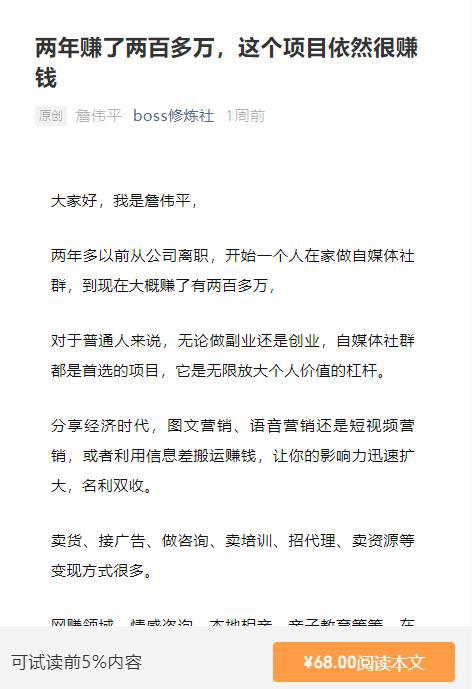 两年多以前从公司高职,开始一个人在家做自媒体社群,到现在大概赚了有两百多万对于普通人来说,无论做副业还是创业,自媒体社群都是首选的项目,它是无限放大个人价值的杠杆。