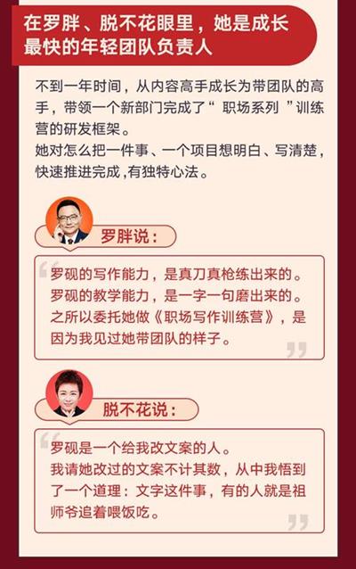 而罗砚老师也是为数不多能一直在罗老师和脱不花身后的那位,帮助他们把梦想变成现实、把他们的每一个决策变成对的事儿,正应了“是金子都会发光”的原理,她是继脱不花、罗振宇之后第三个能被罗胖点头立项开写作训练营的人,而其实力必然早远超你我认知!