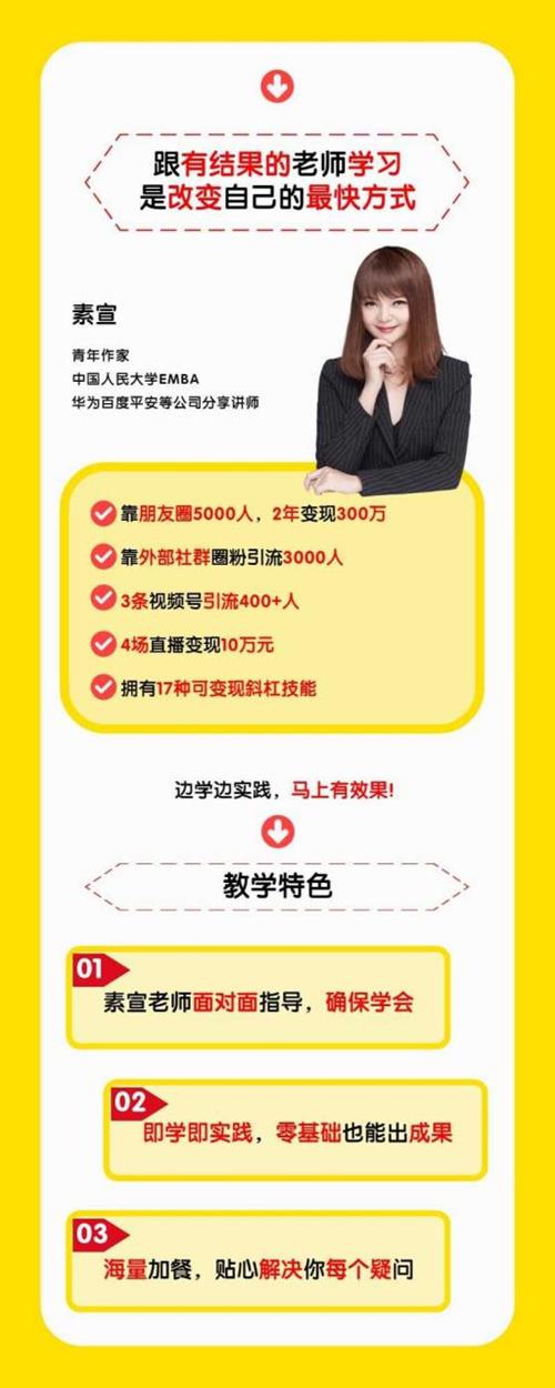 素宣成长学院低成本获客变现营,如何低成本获取线上流量价值2699元,课程教你流量源源不断的秘诀,轻松月入10万,课程从做好产品3要素开始讲起:产品定位、产品透、产品矩阵,好产品不如好故事,做好故事机制、故事场景、故事模板让好故事自己会传播,搞销售力朋友圈都具备的两个特点:成交原理、IP打造塑造个人IP唤起目标客户付费欲望,精准聚焦、高效方法、实战演练3个套路,写出朋友圈杀手营销文案加上”点石成金”营销话术,成交率翻三番,自建社群营销变现力提高10倍的秘诀,吧别人的社群,变成自建的引流池,激活社群沉睡会员,营收翻番。