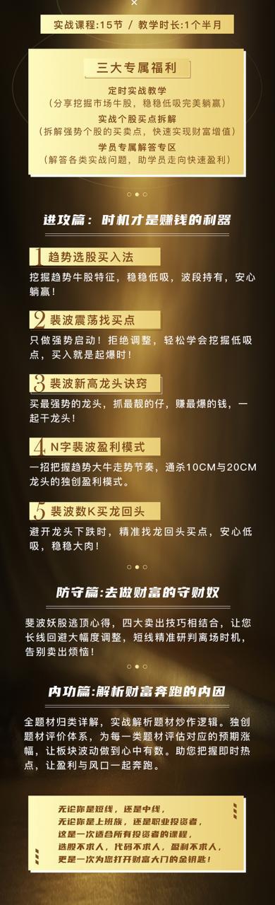 这套最新的课程以实战案例拆解,以实战中个股来预判分析,告诉大家如何选牛股,什么时候买股,什么时候卖股,一整套操作系统课程.帮助学员走向独立操作,稳定盈利的路上。整套交易系统都是实战知识,最大的作用就是帮助学员选股不求人,代码不求人,盈利不求人。