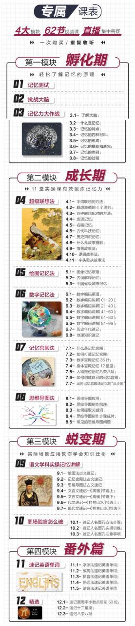 12章大脑潜力开发系统课程,5大实践提升记忆力方法,共62集精彩视频课程,每一分钟都是方法与技巧