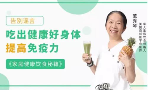 本课程由华人生机饮食领路人范秀琴老师亲身践行,通过饮食及运动两方面入手,从蔬果谷类、肉蛋奶以及调味品引申展开,尤以中老年人的饮食原则为重点,用最简便的方式,阐述了自然养生理念,告诉大家如何在日常生活中落实健康的饮食方式,从而获得健康的身心,同时也学会如何为自己制定可行的健康计划,从而获得“不生病的秘密”!