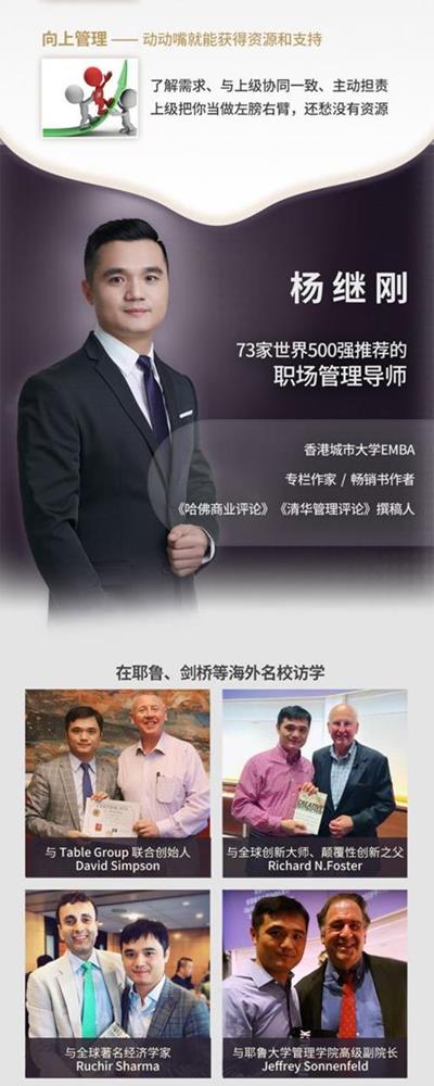 你每天工作会遇到这些烦心事么 现在这个上司真难伺候,他根本就不懂管理 希望得到上司的器重,怎么能从团队脱颖而出我 做了多年业务骨干,转型做管理者我能行吗 新来的怎么教都不会,我要替他做吗 曾经的兄弟能干的刺头,怎么让他们服管 带过几个人的小Team,感觉有点不对路 杨老师的职场管理课给你支招!