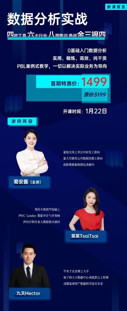 菊安酱、菜菜、九天联合授课,菊安酱主讲,超强师资阵容!八周集训+六大行业+四款工具,带你从0入行数据分析