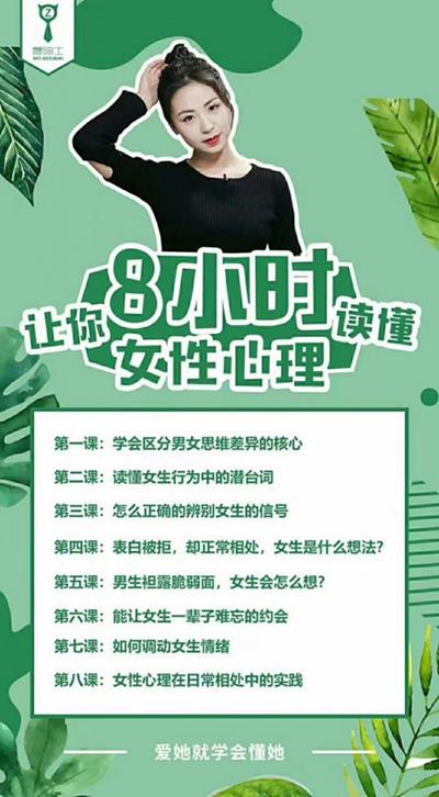 这套课程是站在女性视角为男同胞详细剖析关于女性心理以及背后的动机,让男同胞更加了解女性的心理从更容易追到女生。课程一共8节实操课程,从学会区分那女思维差异核心开始讲起,教你读懂女生行为的潜台词,怎么正确的辨别女生的信号,在你表白的时候被拒,却正常相处,女生是什么的想法?男生袒露脆弱的一面女生会怎么想?能让女生一辈子难忘的是怎么的约会?如何调动女生的情绪?如何在日常相处中用女性心理实践?爱他你就要读懂她的心理!在课程中老师都会一一解答!