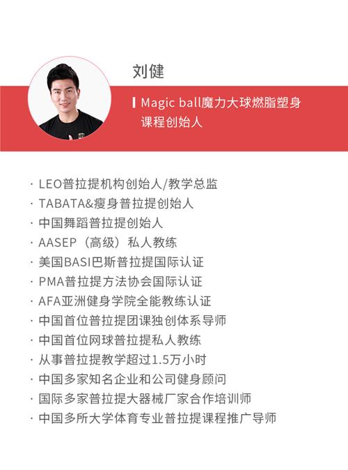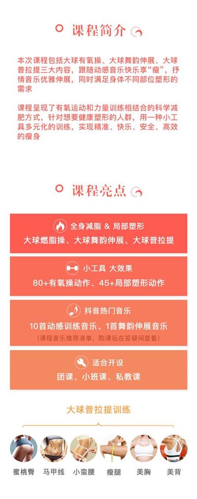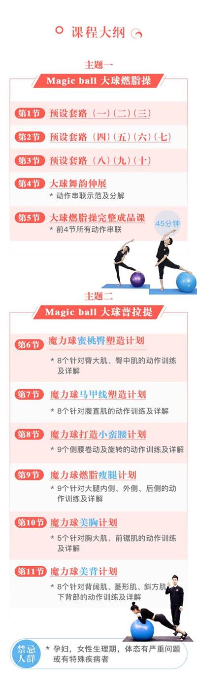 Magic ball魔力大球燃脂塑身系列课,本次课程包括大球有氧操、大球舞韵伸展、大球普拉提三大内容,跟随动感音乐快乐享“瘦”,抒情音乐优雅伸展,同时满足身体不同部位塑形的需求,课程呈现了有氧运动和力量训练相结合的科学减肥方式,针对想要健康塑形的人群,用一种小工具多元化的训练,实现精准、快乐、安全、高效的瘦身。