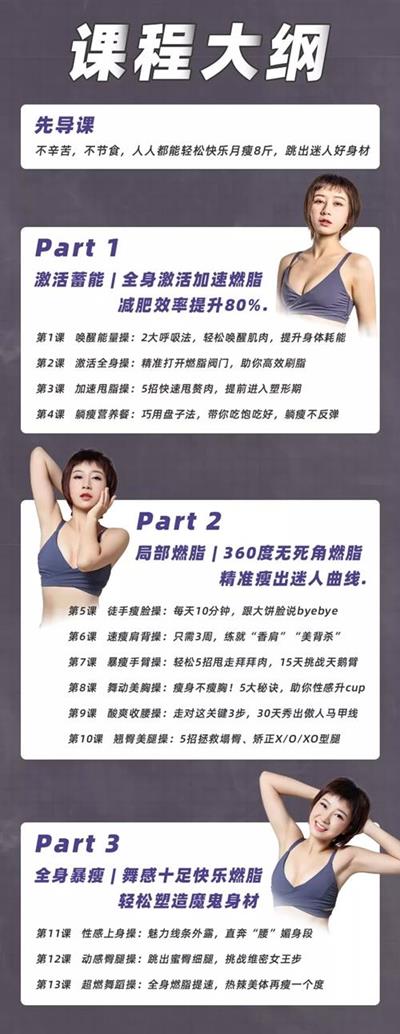 这套课程凝聚了老师11年的健身经验、10000多个学员的案例,从激活蓄能、局部燃脂、全身暴瘦三大模块出发,还有大彩蛋——科学饮食瘦身法!