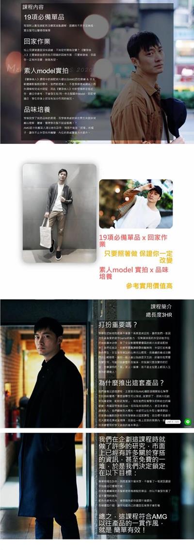 《AMG变身情人》课程内容:19项必备单品每项附上数张搭配照片及购买重点讲解让你不再手足无措,买衣服变得更简单!课程中的搭配照片都是出自AMG四位教练与交友摄影服务的学生,都是素人不是模特大明星,因此《变身情人》中的穿搭更贴近你适合参考,培养品味!
